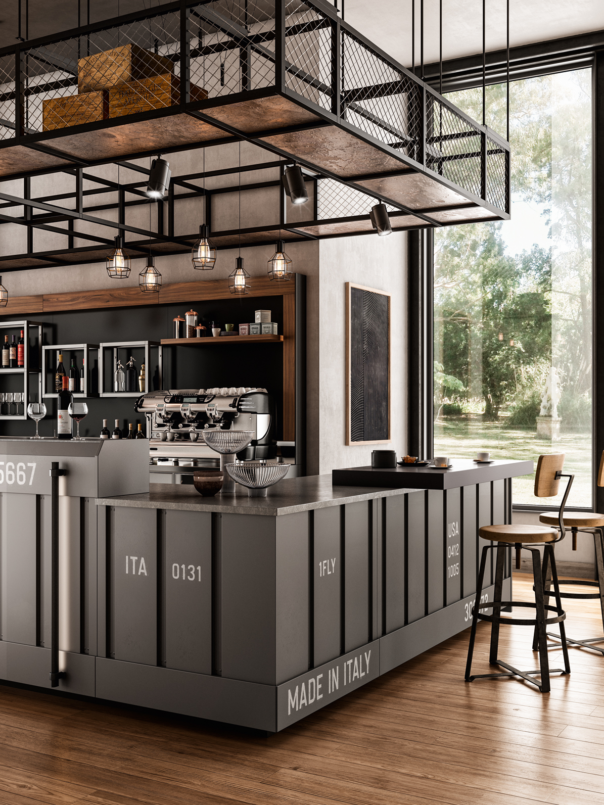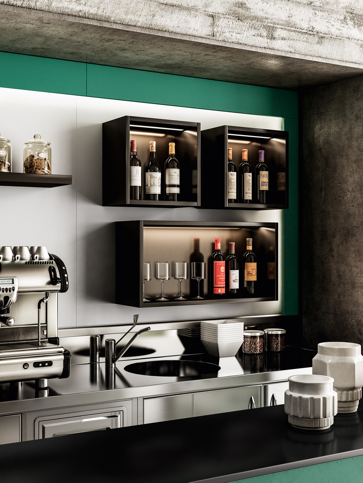 La poignée décorative est disponible en couleur Corten, noir ou dans la couleur du panneau avant. L’éclairage LED est inclus de série. Container peut être équipé de nombreux modules et accessoires, tels que des vitrines réfrigérées, des comptoirs encastrables, des bacs à glace, des comptoirs neutres ou réfrigérés. Le panneau avant en acier peint peut être personnalisé sur demande avec des inscriptions ou des graphiques – comme un véritable container.