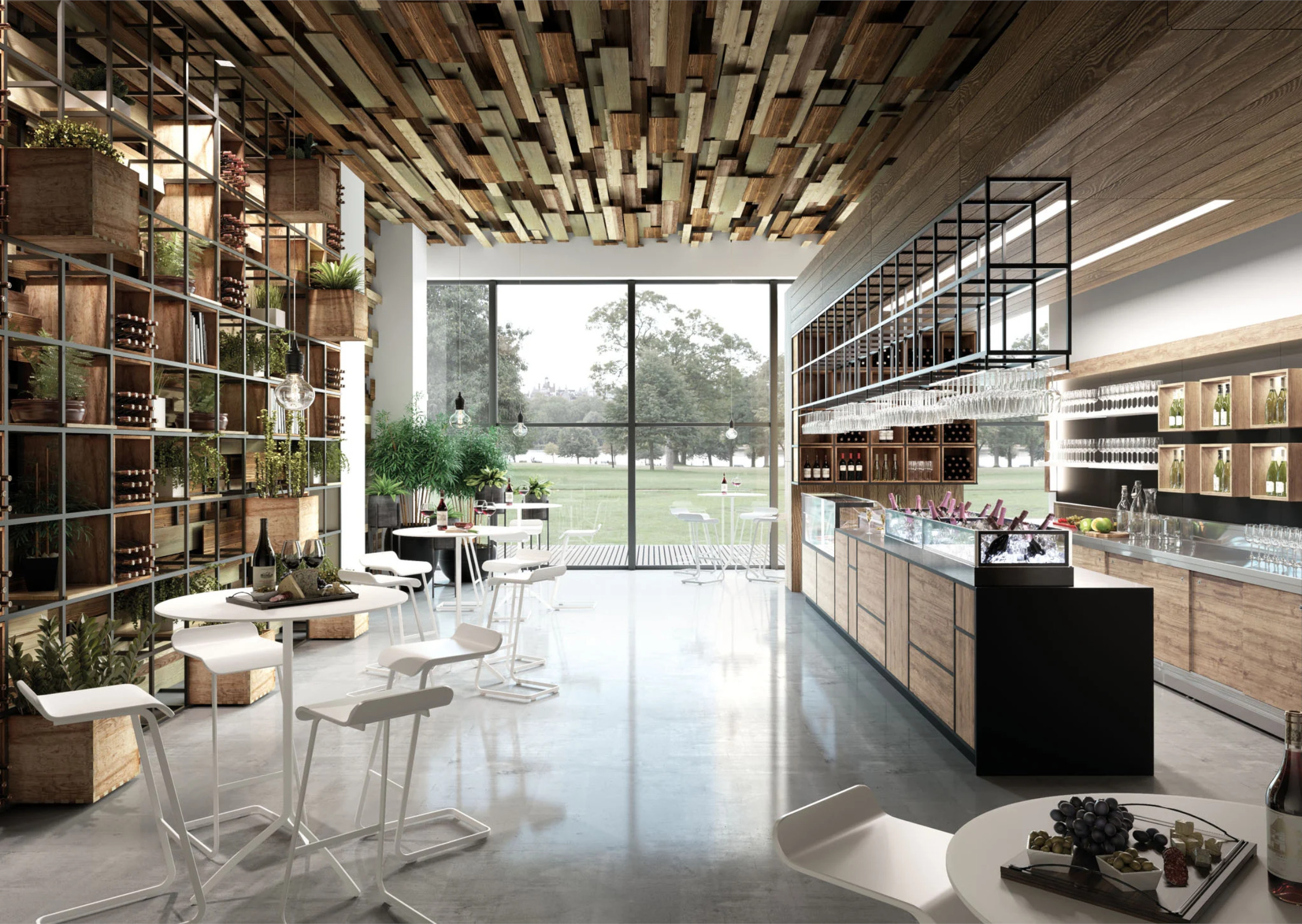 Un choix puissant et au caractère affirmé, qui confère à l’espace une atmosphère chaleureuse et accueillante grâce aux teintes nobles du bois brossé et aux profils élégamment laqués en noir. L’endroit idéal pour un apéritif, de longues conversations ou simplement pour savourer un café et rencontrer des gens.