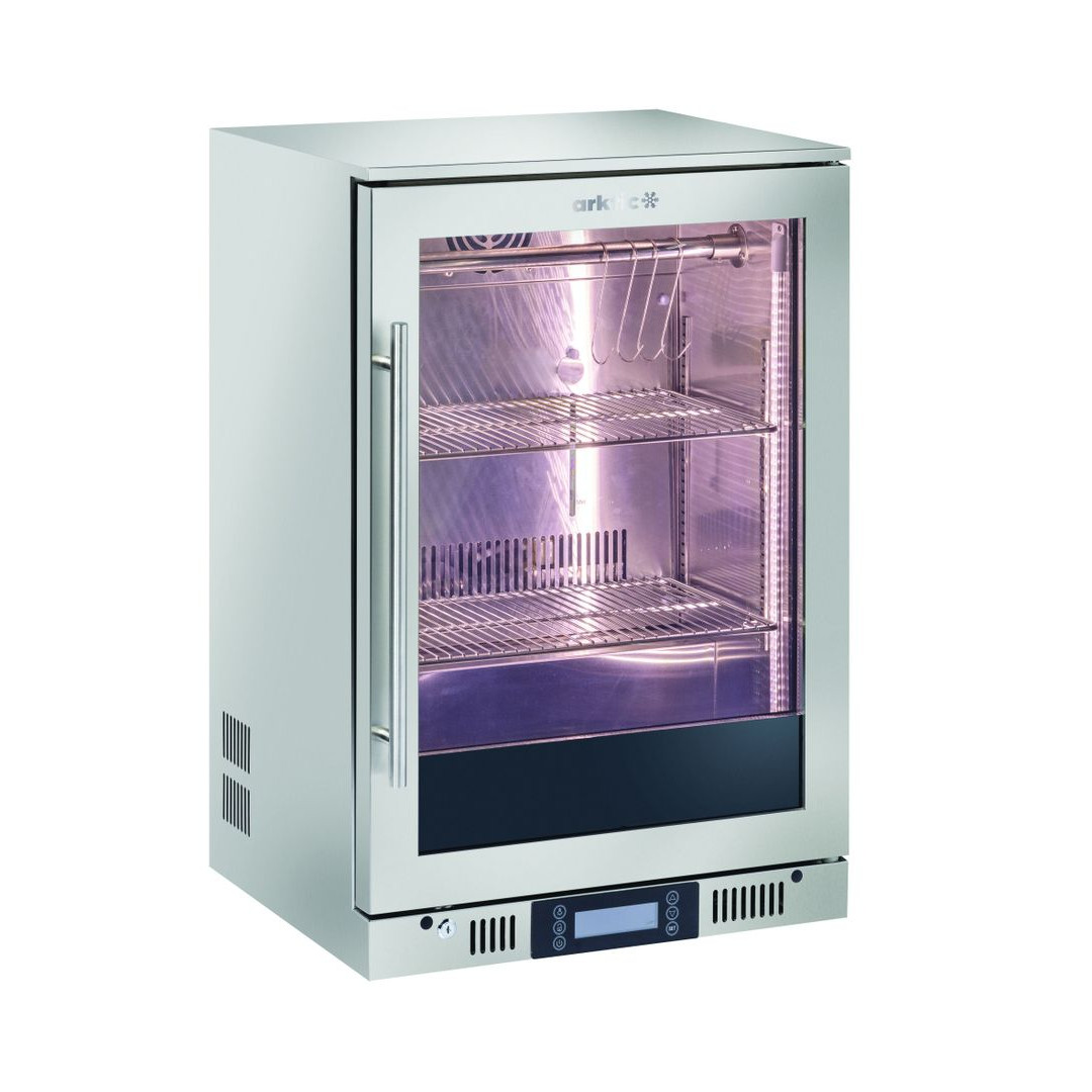 Der Artkic Untertisch-Trockenreifeschrank bietet Präzision, Hygiene und Stil auf kleinstem Raum Er besteht aus hochwertigem 18/8-Edelstahl und doppelschichtigem, getöntem Low-E-Glas und bietet die ideale Umgebung für die Trockenreifung von Fleisch. Funktionen wie Zwangsbelüftung, UVC-Sterilisation sowie optische und akustische Alarme sorgen für Kontrolle und Sicherheit, während die LED-Beleuchtung die Sicht im Inneren der Kammer verbessert.