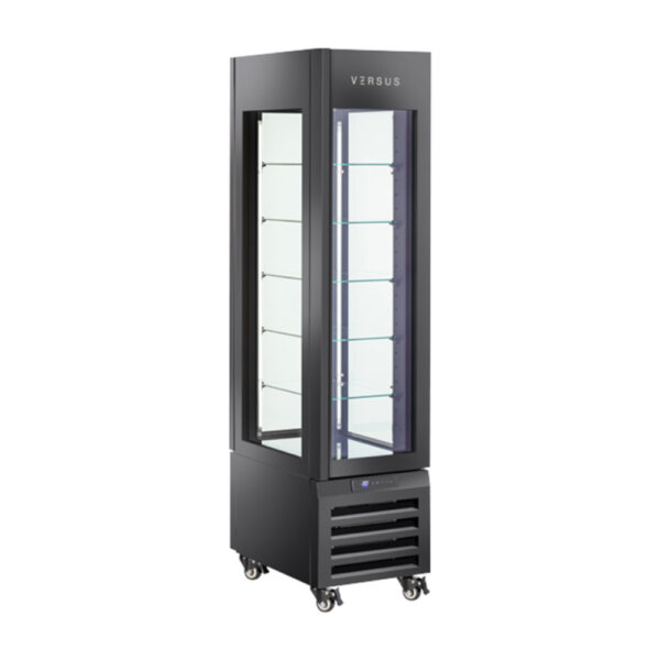 Dieses Modell mit einer 450 mm breiten Einzeltür wurde für kleinere Räume konzipiert und so gestaltet, dass es die ausgestellten Produkte optimal zur Geltung bringt – mit vier rundum verglasten Seiten mit schwarzer Siebdruckverzierung, fünf Glasablagen und vier integrierten LED-Leuchten.
