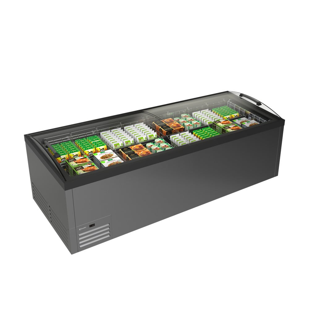 - Maximale Sichtbarkeit der ausgestellten Produkte dank gebogener, rahmenloser Schiebescheiben ohne Kunststoffprofile